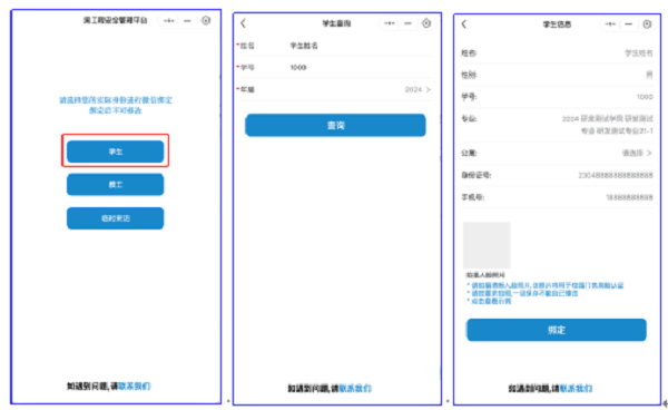 “查询”,核实学生信息后点击“绑定”即可进入小程序。