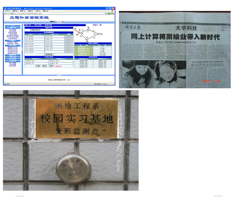 科学研究 教育教学研究和科学研究是学科建设的前提与拉动力,教研、科研成果的水平,直接反映了师资队伍的水平,也直接影响想到教学质量的提高。根据我院的实际情况,我们把教研、科研的重点放在专业建设、学科建设及应用研究、实验开发和工程技术研发方面。科研方向是:GPS定位与导航、专题GIS的开发与应用、数字摄影测量方法、4D生产作业流程与质量控制、测量数据处理与分析、全站仪测量及应用、变形观测与变形分析、测量软件开发与应用等,并逐渐形成自己的优势和特色。结合这些研究方向,积极鼓励教师开展教育教学研究和科学研究,申报各级各类研究项目。近5年来,承担了44余项纵、横项科研项目,总经费达1120.83万元,其中省部级以上项目24项,厅局级、校基金、横向合作项目共20项;在各类学术期刊上共发表论文104篇,SCI、EI等收录17篇,公开出版专业教材8部,专著3部。科研项目和论文共获得奖励9项,其中黑龙江省测绘科技进步一等奖两项,省测绘学会优秀论文一等奖两项,省高校科学技术奖二等奖四项,省高校科学技术三等奖两项,省自然科学技术学术成果奖二等(论文类)两项,省自然科学技术成果奖三等(论文类)四项,省科学技术进步奖二等(论文类)一项,省科学技术进步奖三等(论文类)一项,“地理信息中心杯”优秀论文一等奖一项,二等奖三项。