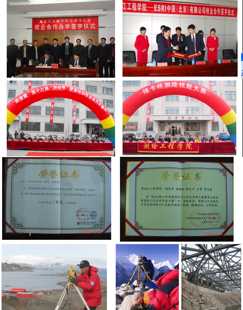 校外实习基地 多年来与黑龙江省测绘局、黑龙江省地理信息产业园、黑龙江省地质调查研究总院、哈尔滨、齐齐哈尔、牡丹江、佳木斯及大庆市的勘察测绘研究院、长春经济技术开发区测绘院、吉林市勘察测绘院、北京高阳明天公司、MapGIS公司、山东正元公司、北京昌平数码公司、兰诺数码公司等企事业单位建立了长期良好的产学研合作关系,形成比较稳定的科研和工程实践基地。