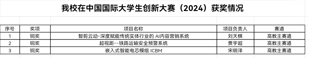 中国国际大学生创新大赛(2024) 由教育部等部门与上海市人民政府共同举办,共有5406所学校的514万个项目、2083.6万人次报名参赛。。 经专家评审、项目公示、大赛监委会核查,共产生获奖项目4640个。其中,我校有3个项目在高教主赛道喜获铜奖,现将获奖结果公布如下。