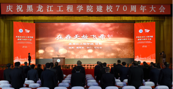与会师生起立合唱校歌《在春天放飞希望》,悦耳的歌声在会场久久回荡。 庆祝黑龙江工程学院建校70周年大会胜利闭幕。