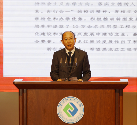 省教育厅二级巡视员丁哲学同志宣读了黑龙江省委、省政府致黑龙江工程学院建校70周年贺信。贺信指出,黑龙江工程学院建校70年来,始终坚持为党育人、为国育才初心使命,秉承“明德求真、知行合一”的校训精神,厚植在交通、测绘等行业领域的办学特色和办学优势,积极推动转型发展,建设特色应用型大学,培养和造就了10万余名应用型工程技术人才,在社会主义现代化建设和龙江振兴发展中建功立业,赢得了“工程师摇篮”的社会赞誉,为服务龙江振兴发展作出了积极贡献。新征程新起点,希望黑龙江工程学院坚持以习近平新时代中国特色社会主义思想为指导,深刻领悟“两个确立”的决定性意义,不断增强“四个意识”、坚定“四个自信”、坚决做到“两个维护”,走内涵式高质量发展道路,努力建设特色鲜明的高水平应用技术大学,在龙江奋进新征程、再创新辉煌中建功立业,为聚力实现全面振兴全方位振兴作出新的更大的贡献。