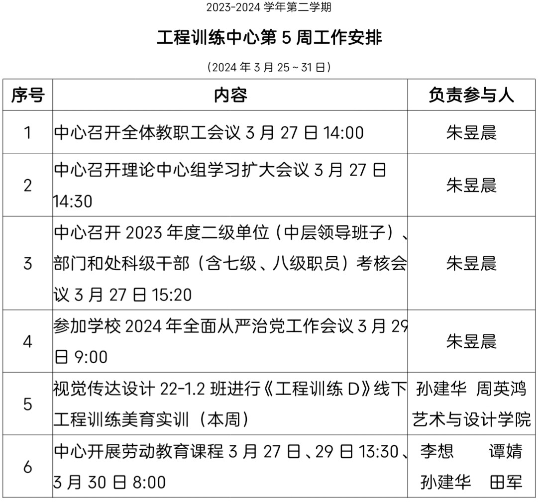 工程训练中心2023-2024(2)第5周工作安排