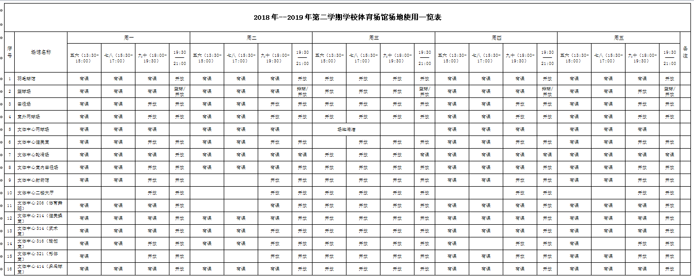 4、表内各场馆如遇活动,开放时间以体育部通知为准 5、此表每学期更新