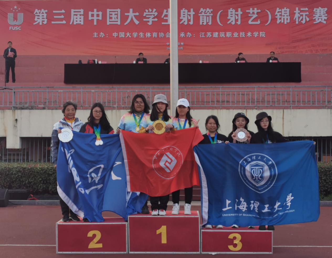 2019年第三届中国大学生射箭(射艺)锦标赛10月25至27日在江苏建筑职业技术学院举行。本次比赛由中国大学生体育协会主办,江苏建筑职业技术学院承办,来自全国68所高校的564名选手参赛。我校射箭队6名运动员在体育教研部谢明晔老师的带领下参加反曲弓项目的比赛,并取得优异成绩。 经过两天的激烈角逐,我校射箭队在反曲弓组别中共获7类奖项。赵金雨、陈铎、耿小草获得“反曲弓甲组女子30米团体淘汰赛”第一名,以1604环成绩获得“反曲弓甲组女子30米团体排名赛”第五名;李松霖、王伟、袁宗锐获得“反曲弓甲组男子30米团体淘汰赛”第四名,以1823环的总成绩获得“反曲弓甲组男子30米团体排名赛”第三名;王伟、赵金雨以1220环的总成绩获得“反曲弓甲组混合团体30米排名赛”第四名。在个人项目中,赵金雨获得“反曲弓甲组女子30米个人淘汰赛”第七名,以590环成绩获得“反曲弓甲组女子30米个人排名赛”第七名。