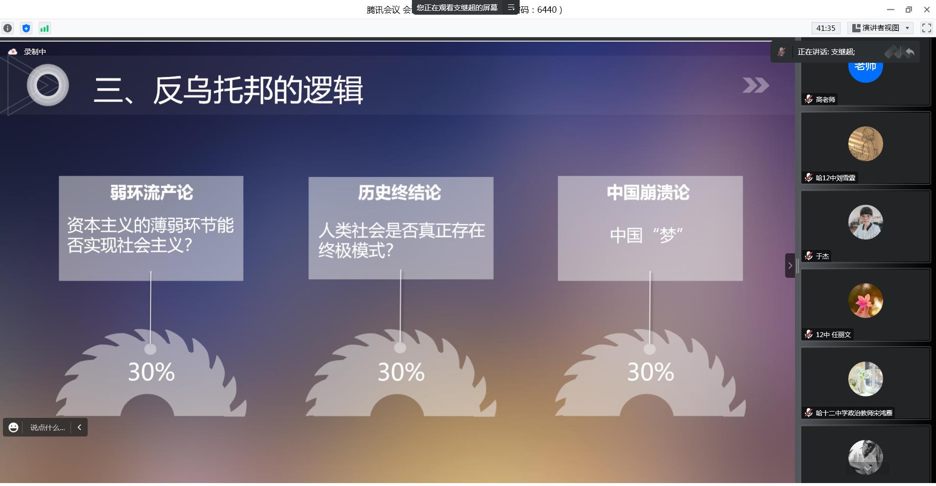 2022年11月16日,马克思主义学院举办“思远讲坛”系列学术交流活动暨思政课大中小一体化集体备课会。马院全体教师、哈尔滨市第十二中学政治课教师及我校部分学生共同聆听了讲座。本次“思远讲坛”邀请吉林大学马克思主义学院支继超教授做了“马克思主义发展进程中未休的激辩”的学术报告。 支教授从“何谓乌托邦”入手,通过问题链,层层抽丝剥茧,为师生解惑了马克思主义是否是一种乌托邦,从理论维度为教师们辨析了反乌托邦的逻辑,最后阐释了马克思主义的反“反乌托邦”回应。支教授敏锐的科研思维、高超的思辨能力、丰富的语言和渊博的知识令大家印象深刻。报告不仅开阔了教师们的科研视野,而且也为教学提供了帮助,引发了理论与实践相统一的深度思考,更为师生深刻学习领会党的二十大报告提供了新视角,为深入理解马克思主义中国化时代化提供了新思考,为我们追求真理、揭示真理、笃行真理提供了新理路。 支继超博导,吉林大学行政学院国际政治专业本、硕、博,台湾大学政治学系硕士交换生,美国丹佛大学约瑟夫·科贝尔国际问题研究院联合培养博士,吉林大学马克思主义理论博士后。现为吉林大学马克思主义学院博士生导师,兼任吉林大学青年文化书院导师,吉林省政协理论研究会会员,共青团吉林省委吉林青年讲师团讲师。主要研究领域:政治发展、世界政治、国外马克思主义。