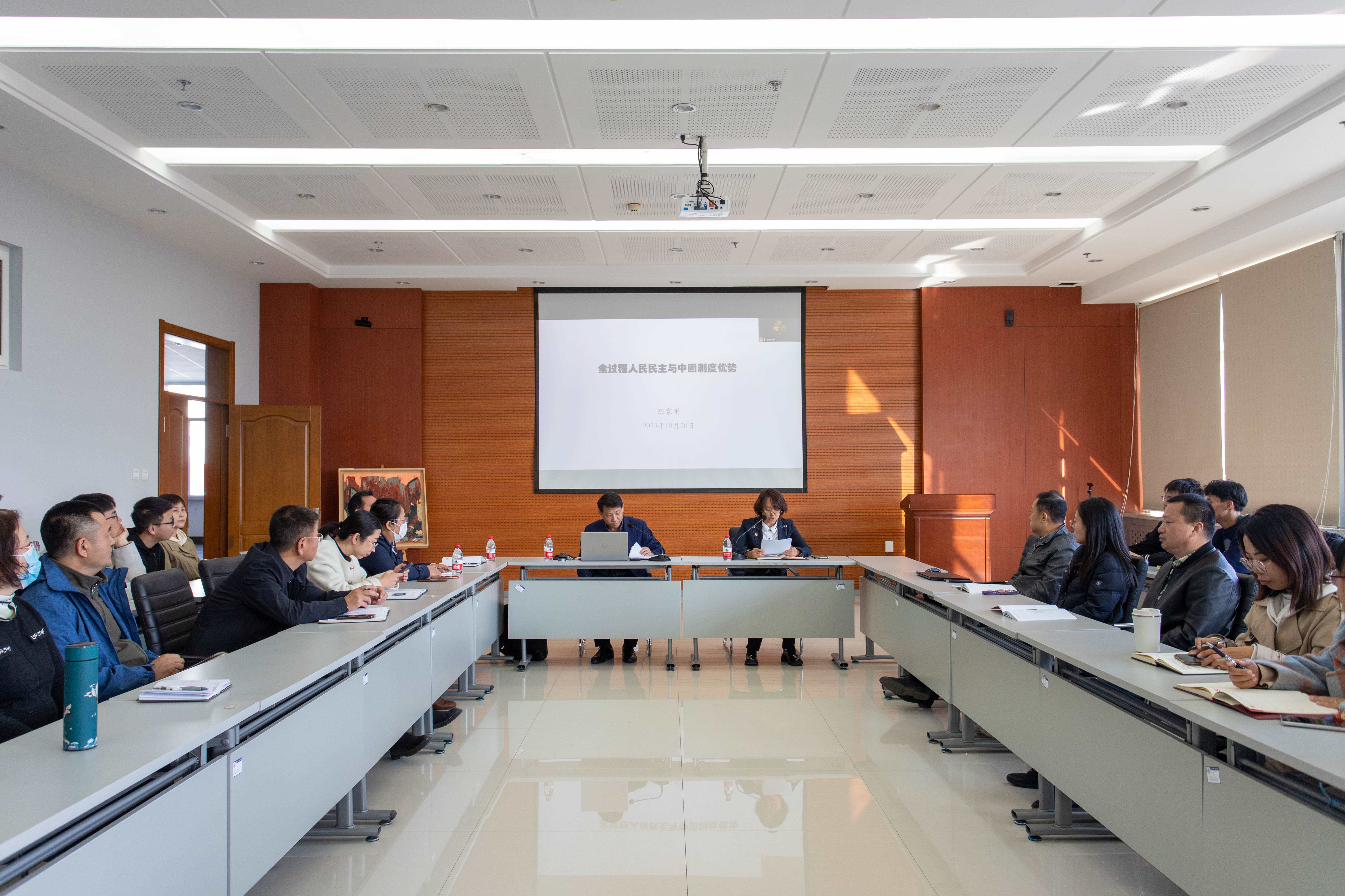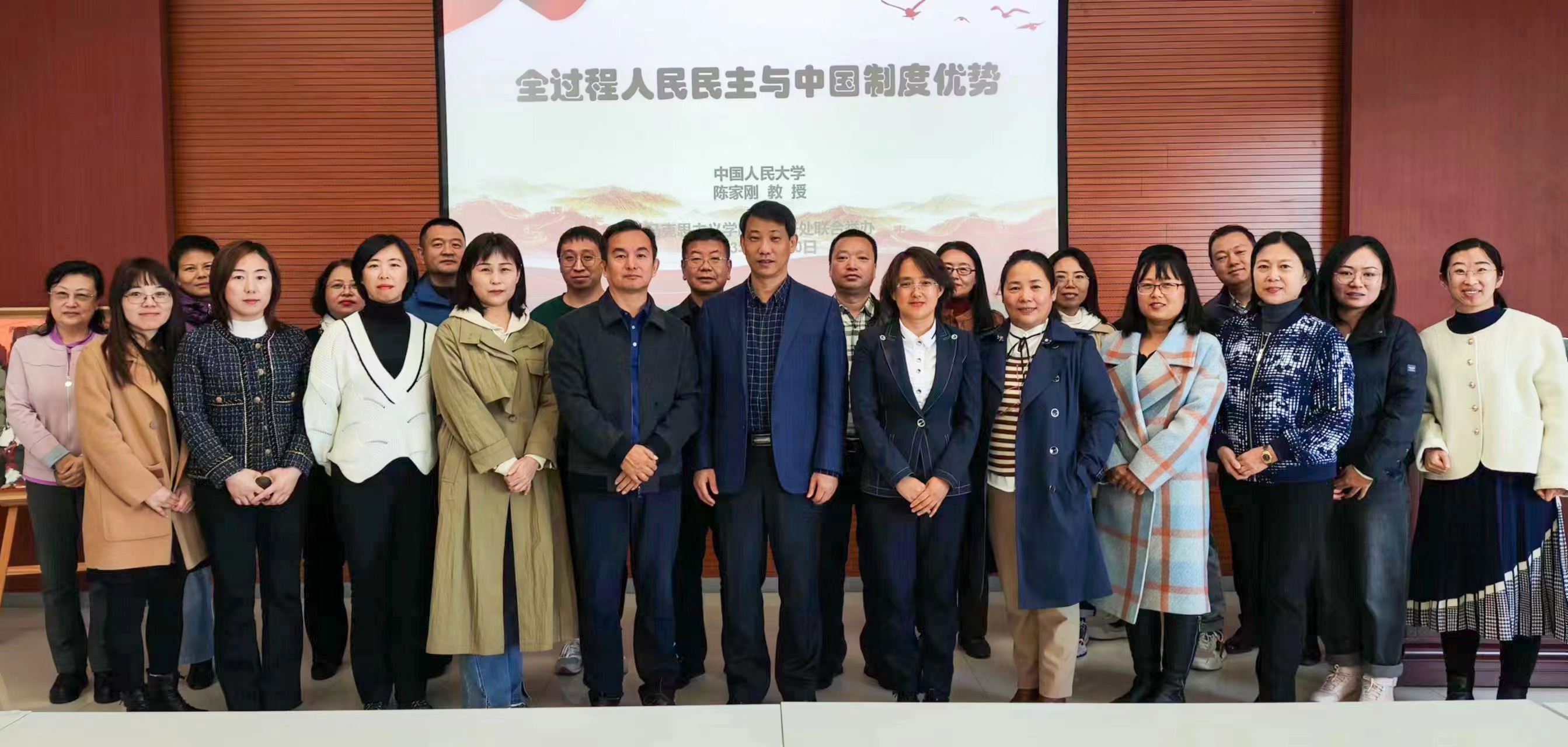 为深入学习贯彻习近平新时代中国特色社会主义思想,强化科研与教学相协同,拓宽教师学术思路,提升师生马克思主义理论水平,10 月 19 日,马克思主义学院联合科研处共同举办第八期“思远讲坛”暨习近平新时代中国特色社会主义思想概论课第八专题集体备课会。特邀请中国人民大学中共党史党建学院陈家刚教授作了题为“全过程人民民主与中国的制度优势”的学术报告。马克思主义学院全体教师及部分学生聆听了报告。
