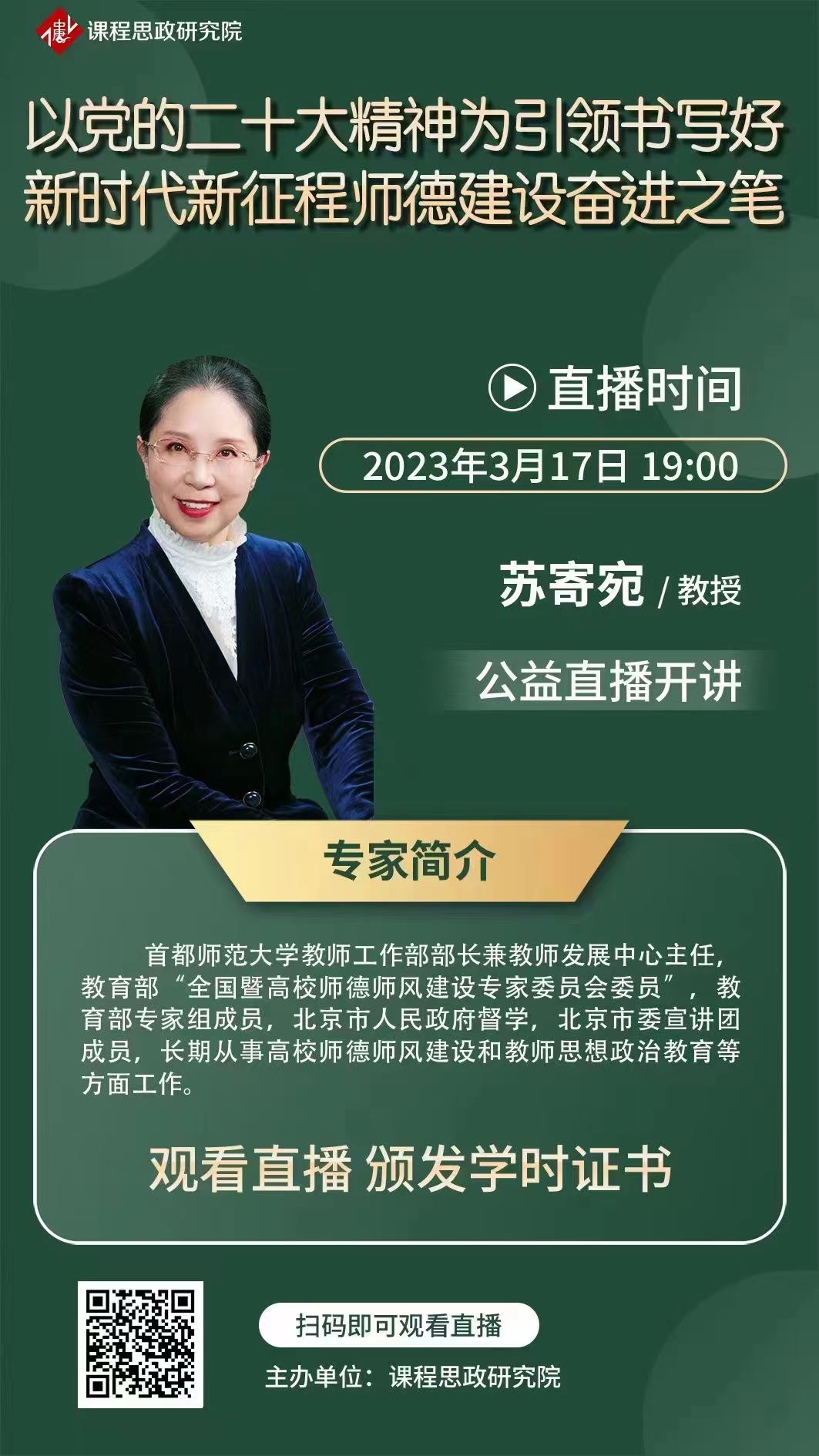各位教师: 根据学校教师发展中心的工作通知,请学院全体教师参加本次培训。 课程主题:以党的二十大精神为引领书写好新时代新征程师德建设奋进之笔。 主讲专家:苏寄宛教授--首都师范大学教师工作部部长兼教师发展中心主任,教育部 “全国暨高校师德师风建设专家委员会委员〞,北京市人民政府督学,北京市委宣讲团成员,长期从事学校师德师风建设和教师思想政治工作的研究和实践。 直播时间:3月17日周五 19:00 点击下方链接观看直播: https://bhj.h5.xeknow.com/sl/ABmku 电脑端可以登录网站观看!
