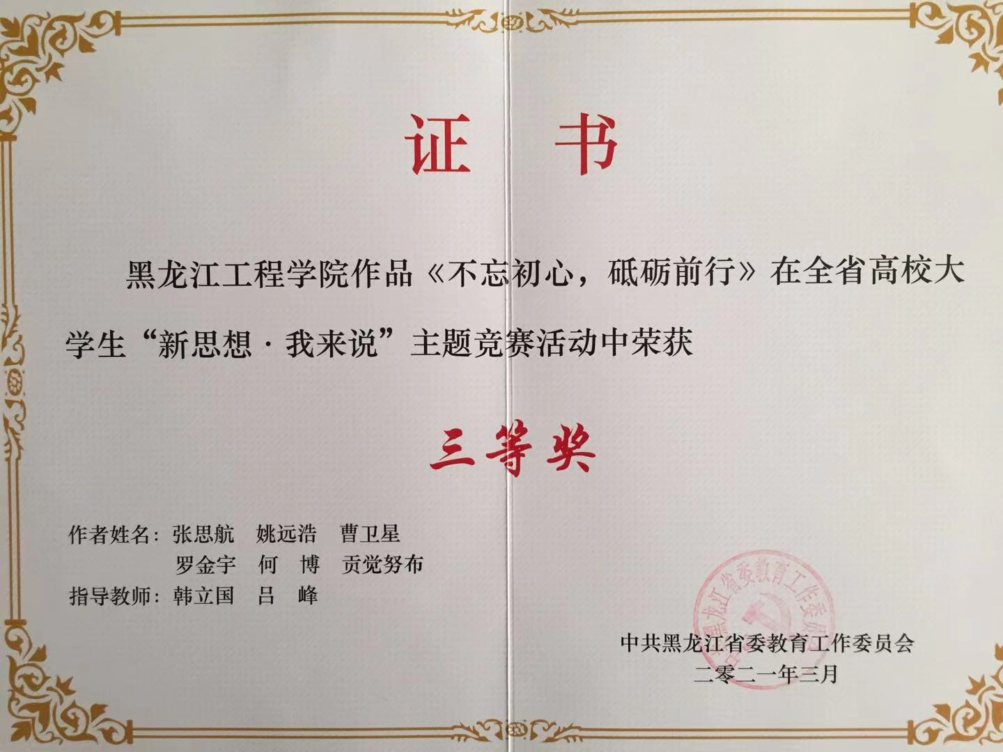 近日,思政部韩立国老师指导我校6名学生参加了黑龙江省“新思想•我来说”省高校大学生主题竞赛活动。经过激烈角逐,层层比拼,最终荣获省级三等奖。