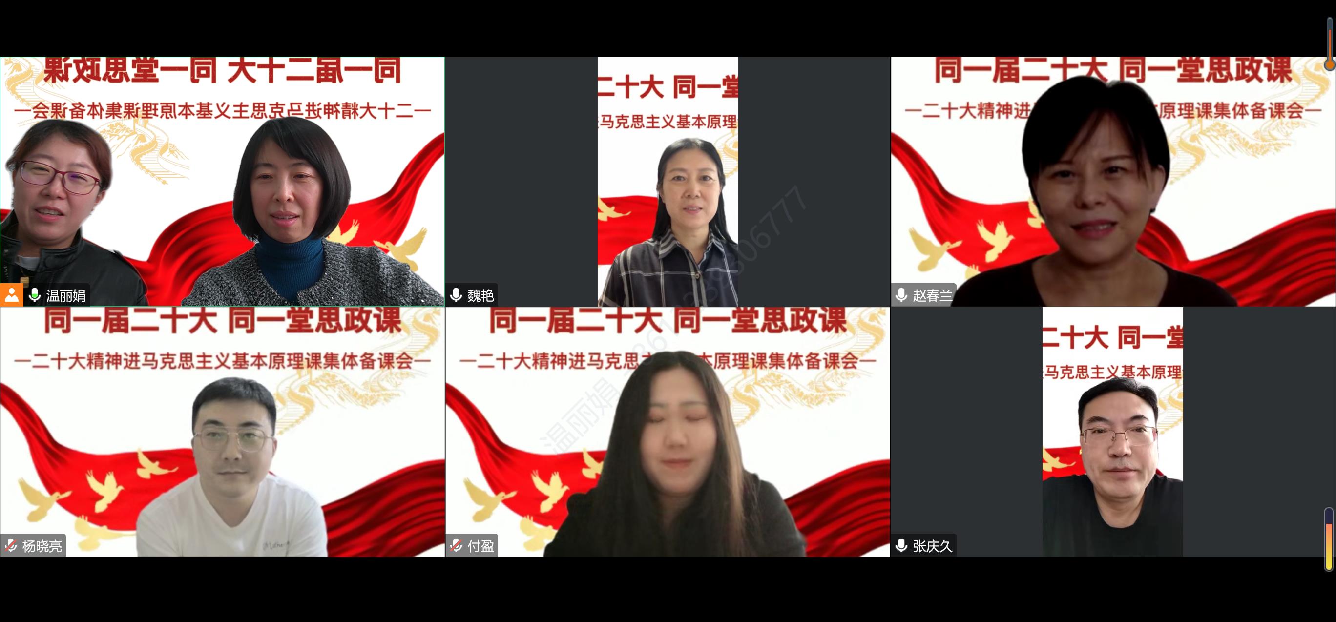 为了尽快和更好将党的“二十大”精神进课堂、进头脑,10月26日下午,按照学院工作部署,全体思政课教师以教研部为单位齐聚“云端”,以“同一届二十大 同一堂思政课”为主题开展集体备课会。 集体备课会前戴明清院长再次强调:作为思政课教师要率先学习领会、准确理解把握、主动宣传阐释好党的二十大精神,要及时将会议精神融入到各门思政课程中,用党的创新理论武装师生头脑、指导育人实践,为培养担当民族复兴大任的时代新人作出我们应有的贡献。 教师们在集体备课会上,紧紧围绕学习研究阐释宣传党的二十大精神,就理论与实践相结合、相关教学科研重点、教学方式方法等展开了线上热烈研讨。教师们一致认为,党的二十大报告是一篇光辉的马克思主义纲领性文献,思想深邃、立意高远、内涵丰富,大家将会认真学习领会党的二十大精神,趁热打铁、迅速安排,将党的二十大精神同思政课有机结合,及时更新教学内容、创新教学方法,让党的二十大精神“带着热气”进课堂。