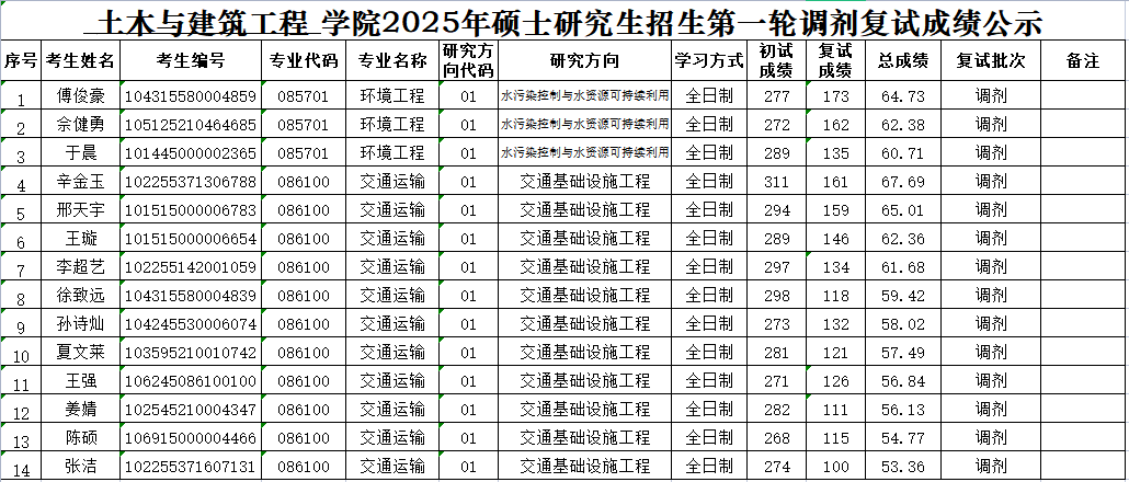 土木与建筑工程学院2025年硕士研究生招生调剂复试成绩公示