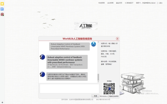 (2)若各大搜索引擎返回的文献不提供下载,则可点击右侧二维码,将所需文献题名(或文献DOI号、文献PMID号等)直接复制到对话框,并点击发送,系统会在10秒左右返回可下载的链接地址;