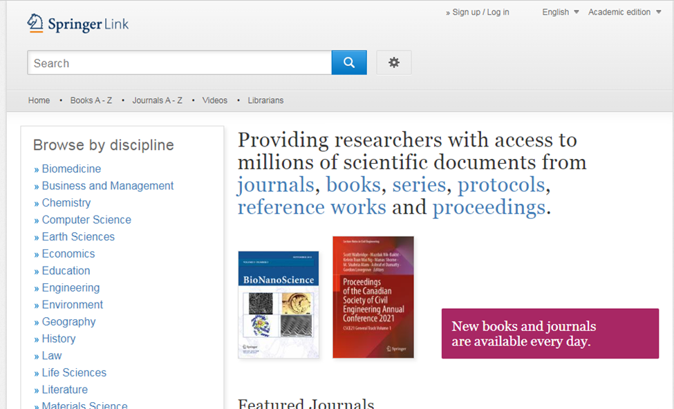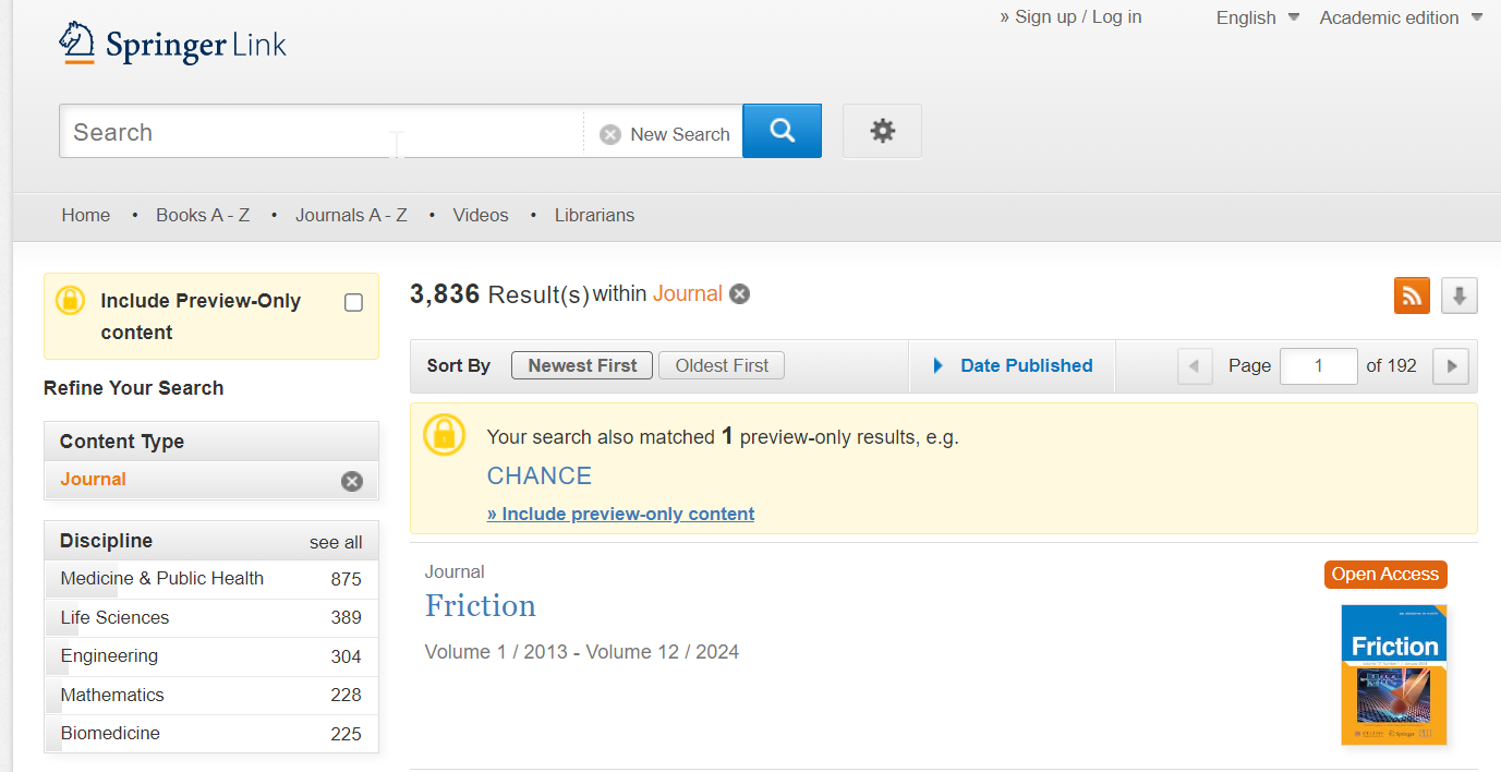 各位读者: 为进一步丰富我校图书馆文献资源馆藏,满足广大师生日益增长的文献资源的需求,保障和促进我校教学、科研和学科建设质量与水平进一步提升,现在面向我校师生开通SpringerLink(斯普林格)数据库。 Springer电子期刊介绍及使用指南 一、资源介绍: Springer每年出版期刊超过2000种,涵盖数学与统计学,化学与材料科学, 计算机科学, 地球与环境科学, 工程学, 物理与天文学, 医学,生物医学与生命科学,行为科学, 商业与经济, 人文社科与法律,共11个学科. Springer出版的期刊60%以上被SCI和SSCI收录,一些期刊在相关学科拥有较高的排名. 目前我馆已订购Springer电子期刊工程学科包。Springer工程学学科是Springer历史悠久的传统强势出版学科。Springer出版180多种工程学领域的电子期刊,包括机械工程、电子工程、计算机工程、材料科工程学等相关领域的学术期刊。Springer工程学电子期刊是世界知名学术出版社出版的专业期刊,在工程学领域具有较高的科研影响力。 二、使用指南: 1.登陆SpringerLink平台(校园范围内IP或VPN访问)。 平台主页:https://link.springer.com 点击页面中间“journals”,进入检索页面。  2.在检索页面左上方,取消Include Preview-Only content 后面方格的勾选,即只显示本校已开通访问权限的电子期刊;同时在左侧Discipline栏中,也可以点击相关学科查找相对应的电子期刊。