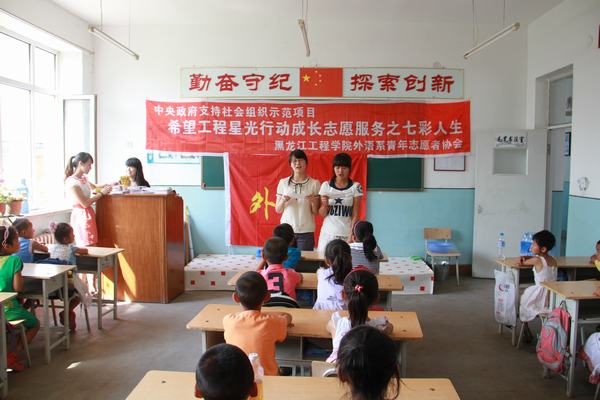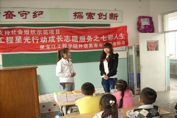 为积极响应团中央、团省委、校团委有关大学生开展社会实践活动的号召,落实《希望工程星光行动成长示范项目》的文件精神,黑龙江工程学院外语系志愿者服务队到哈尔滨市民主乡民主小学开展了“七彩人生”爱心关注农民工子女星光行动。