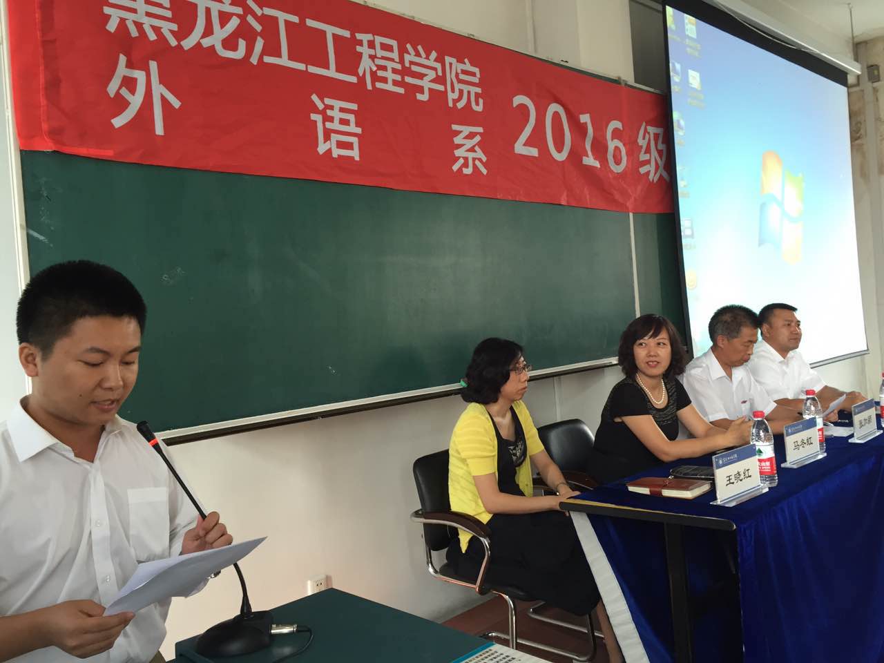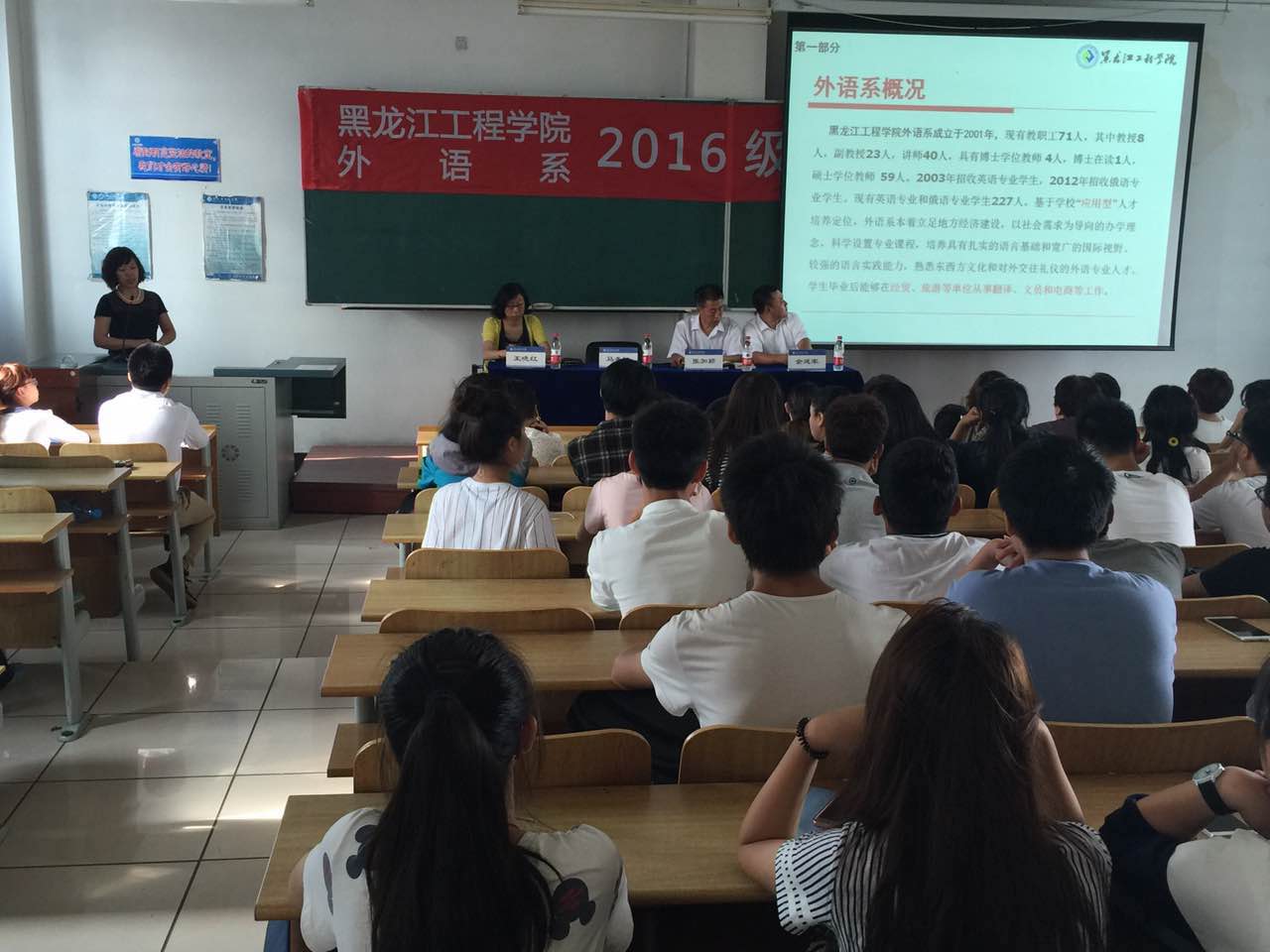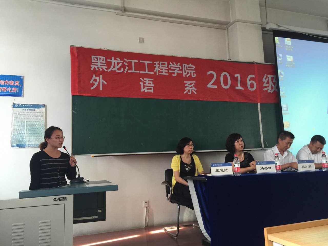 会上,马冬虹主任首先对2016级新生表示热烈欢迎,并介绍了黑龙江工程学院概况、外语系师 资队伍、专业设置、学科建设、发展定位及学生就业情况等,并给学生留下了一个“我到大学来做什 么?我在大学做了什么?我能为我的大学做什么?”的思考。接着老师、新生、老生代表做了发言。最后张加颍书记则重点介绍了新生入学安全等各项事宜,并希望同学们在黑龙江工程学院度过美好的大学生活。