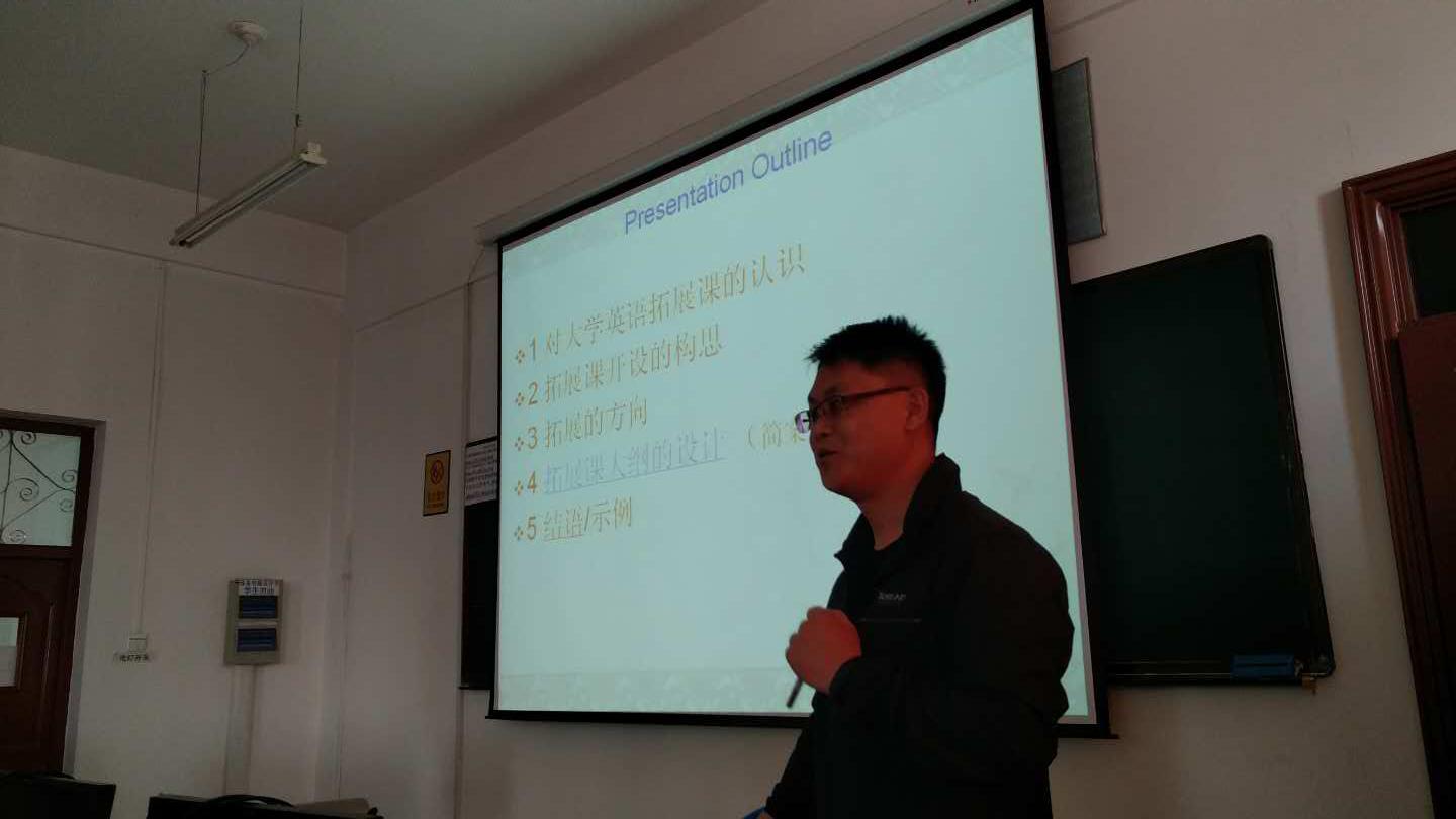 外语系按照学校党委大力推进“人才强校”的战略部署,向内涵式发展,建立导师梯队机制,教授作为带头人,按专业方向形成学术团队,并开展相应的大学英语拓展课。2017年5月10日下午,外语系刘建伟老师和赵昊楠老师进行了关于大学英语拓展课开课思路的学术讲座。