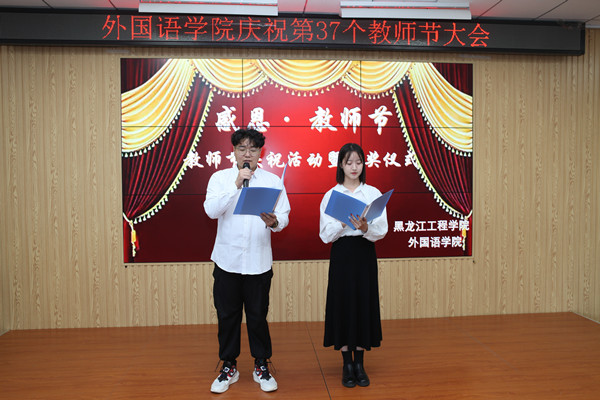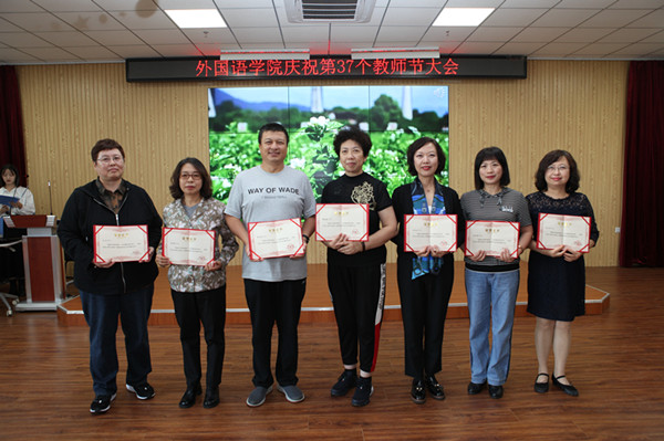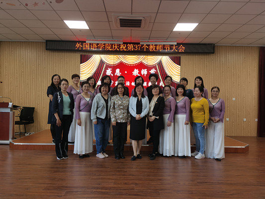 9月10日第37个教师节来临之际,外国语学院以“忆往昔峥嵘岁月 展未来任重道远”为主题组织开展了系列庆祝活动。通过青年优秀教师代表及满30年以上的老教师发表从业感言,与大家分享教学生涯的收获与喜悦;全体教师歌唱歌曲《感恩的心》《莫斯科郊外的晚上》、吟诵毛泽东诗词《沁园春.雪》、学院“舞美时光”舞蹈队表演朝鲜族舞蹈《金达莱》等庆祝形式,欢庆教师们自己的节日。学院领导还为老师们颁发荣誉证书、奖杯。展望新目标,踏上新征程,外国语学院全体教师团队将在学校党委的领导下,树师德、铸师魂,凝心聚力、乘势而上、精心育人,加快教育改革与发展步伐。