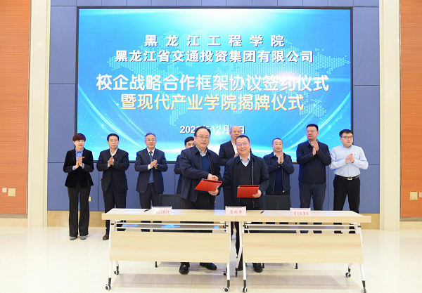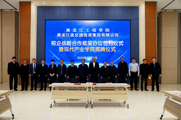 12月3日上午,学校与黑龙江省交通投资集团有限公司(以下简称交投集团)在交投集团会议室举行校企战略合作框架协议签约仪式暨“交通基础设施智能建造与运维技术现代产业学院”揭牌仪式。交投集团党委书记、董事长尚云龙,党委副书记、副董事长、总经理孙雪飞,副总经理韩存玉,学校校长付晓飞,副校长张丰发,副校长叶树江出席签约仪式。交投集团科技发展部副部长计伟帅主持签约仪式。