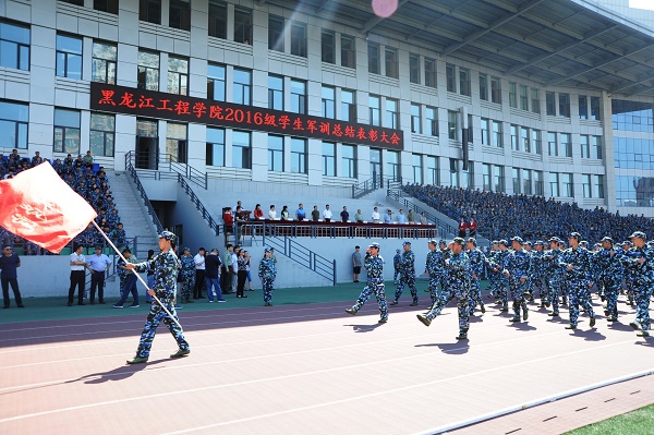 校党委副书记白玉发表讲话。他首先代表学校对黑龙江大学国防教育学院领导、全体教官以及我校12名教官助理和广大学工干部表示崇高的敬意和衷心的感谢,对圆满完成各项军训任务的2016级学生表示热烈的祝贺。白玉副书记指出,今年是军队系统全面深化改革之年,2016级学生军训承训任务的落实遇到困难,黑大国防教育学院克服困难,承担起了今年的军训任务,保证了我校军训工作的顺利进行。特别是全体教官都是毕业生,他们放弃了大学时代告别母校最宝贵最美好的时光,认真负责,圆满完成任务,友谊与担当令我们感动。他强调,大学生参加军事训练,是我国提高全民国防意识和加强国防后备力量建设的重要环节,是培养和提高学生素质的重要举措。在两周的军训生活中,同学们克服了高温多雨等多方面困难,取得了可喜成绩,收获颇丰。最后,白玉副书记对广大2016级学生提出三点希望:一是固化军训过程中结出的丰硕成果。希望同学们在今后的校园生活中,将军训中继承的优良传统和养成的良好习惯保持下去,严于律己,笃行慎独,认真遵守学校各项规章制度,树立集体观念,做“六有”大学生,不断提高自我教育、自我管理、自我服务、自我监督的能力和水平。二是传承军训过程中锻炼的优良品质。希望同学们在以后的学习、生活乃至到未来的工作中,以军人为榜样,树立面对困难和战胜困难的勇气和担当,让当代军人的好思想、好作风激励大家奋勇前行。三是发扬军训过程中凝结的崇高精神。习近平总书记曾寄语青年:要以国家富强、人民幸福为己任,胸怀理想、志存高远,投身中国特色社会主义伟大实践,并为之终身奋斗。希望同学们要牢记总书记的教诲,坚定理想信念,勤奋刻苦学习,创业创新创优,发扬艰苦奋斗精神,锤炼高尚品格,汇聚起实现中国梦的青春力量,让青春的色彩在黑龙江工程学院这片广阔的天空中更加绚丽。