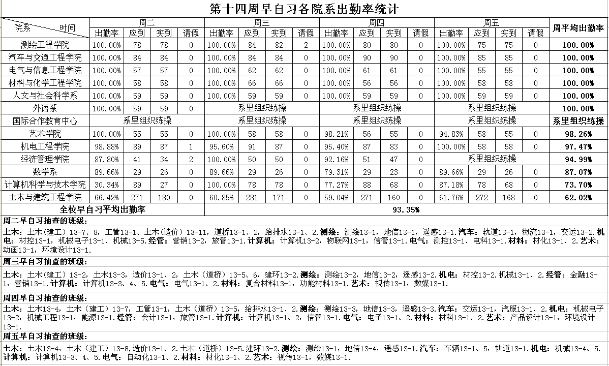 第十四周早自习各院系出勤率统计