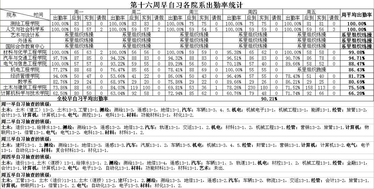 第十六周早自习各院系出勤率统计