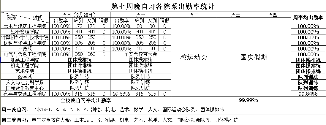 第七周晚自习各院系出勤率统计