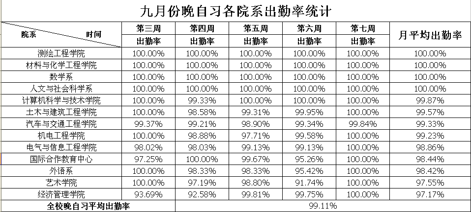 九月份晚自习各院系出勤率统计
