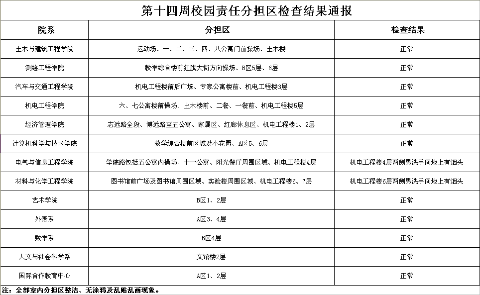 第十四周校园责任分担区检查结果通报
