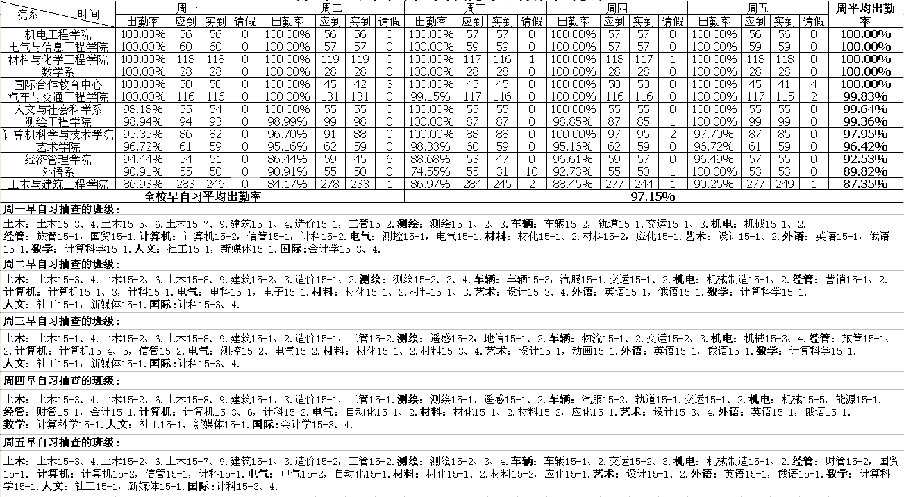 第十一周早自习各院系出勤率统计