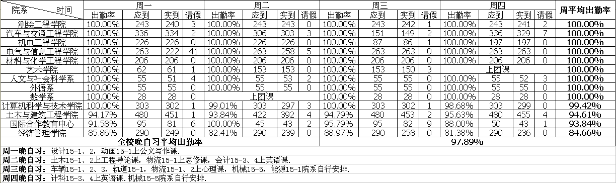 第十四周晚自习各院系出勤率统计
