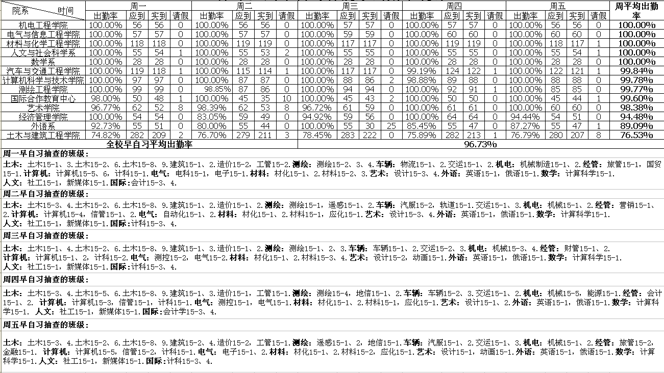 第十五周早自习各院系出勤率统计