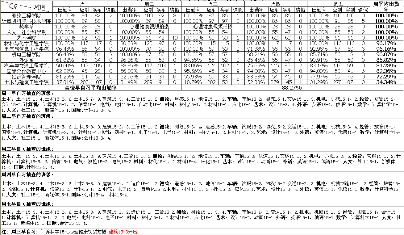 第七周晚自习各院系出勤率统计