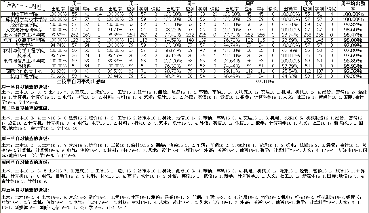 第十周早自习各院系出勤率统计