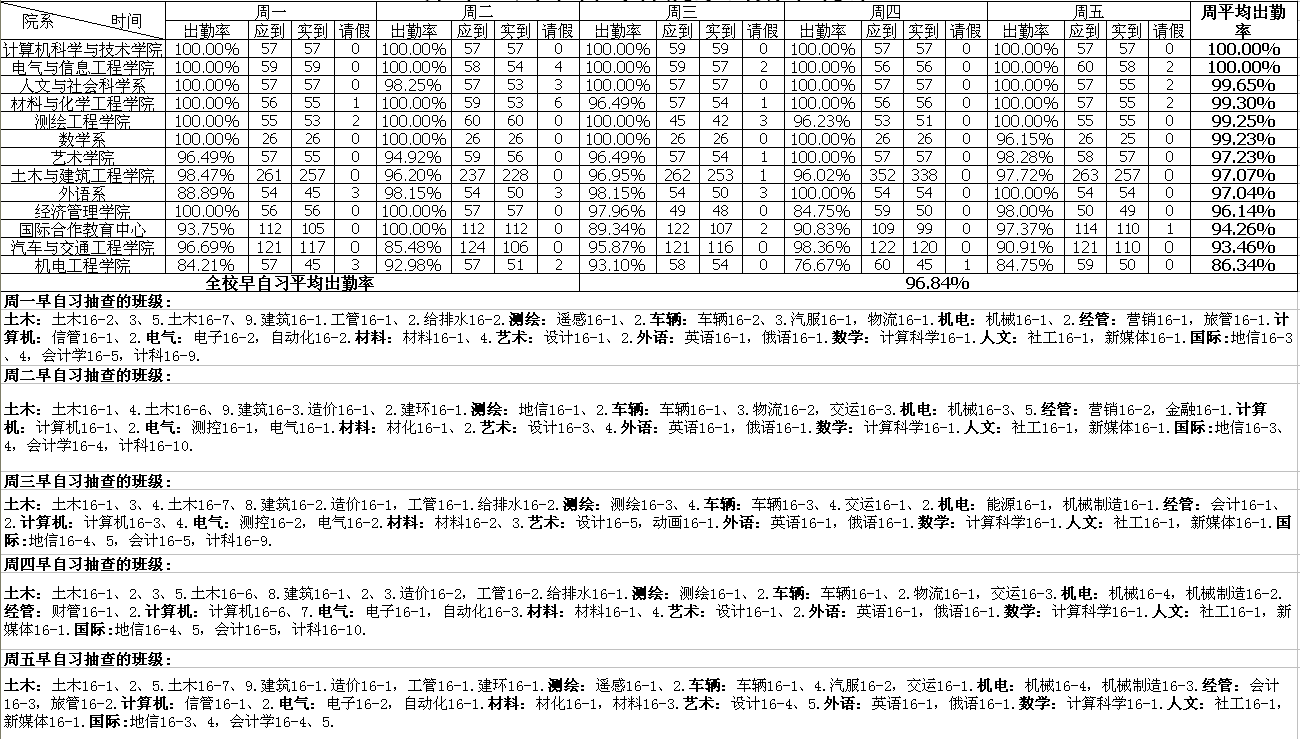 第十三周早自习各院系出勤率统计