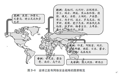 近年来,信息技术迅猛发展,网络安全形势发生了重大变化,发达国家纷纷加强战略谋划,出台新的网络安全战略。截至2015年底,共有44个国家和地区发布或更新了网络安全战略,遍布美洲、欧洲、亚洲、大洋洲和非洲。其中美洲4个国家,欧洲25个国家,大洋洲2个国家,亚洲9个国家,非洲4个国家,共计69份网络安全战略级文件。另有多个国家正在准备出台国家网络安全战略,网络安全战略地位获得进一步提升。