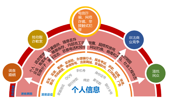 目前,针对个人信息的犯罪已经形成了一条灰色的产业链,在这个链条中,有专门从事个人信息收集和泄密源团体,他们之中包括一些有合法权限的内部用户主动通过QQ、互联网、邮件、移动存储等各类渠道泄露信息,还包括一些黑客,通过攻击行为获得企业或个人的数据库信息。有专门向泄密源团体购买数据的个人信息中间商团体,他们根据各种非法需求向泄密源购买数据,作为中间商向有需求者推销数据,作为中间商买卖、共享和传播各种数据库。还有专门从中间商团体购买个人信息,并实施各种犯罪的使用人团体。他们是实际利用个人信息侵害个人利益的群体。据不完全统计,这些人在获得个人信息后,会利用个人信息从事五类违法犯罪活动: