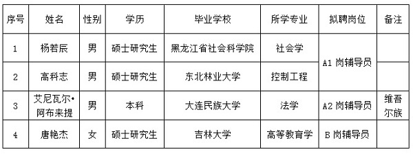 按照《黑龙江省事业单位公开招聘工作人员实施细则》文件精神,根据《黑龙江工程学院2018年公开招聘辅导员公告》的程序要求,现将拟聘用人员予以公示。如对公示人员有异议,可在公示期内反映,反映情况和问题必须实事求是,应签署或告知真实姓名、工作单位和联系方式。对线索不清的匿名信和匿名电话,公示期间不予受理。
