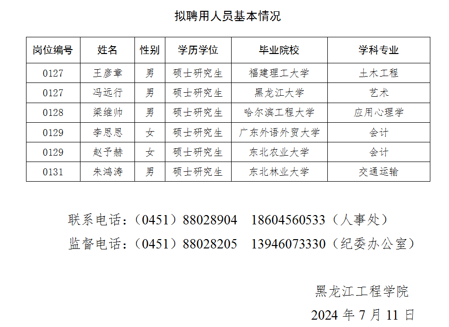按照《黑龙江省事业单位公开招聘工作人员实施细则》的相关规定以及《黑龙江工程学院2024年上半年公开招聘事业编制工作人员公告》的要求,现将本次招聘拟聘用人员进行公示。公示期为2024年7月11日至2024年7月19日(7个工作日)。