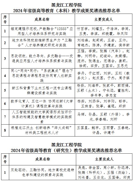 根据省教育厅《关于开展2024年黑龙江省高等教育(本科、研究生)和职业教育教学成果奖评审工作的通知》要求,学校组织开展了省级高等教育(本科、研究生)教学成果奖遴选推荐工作。