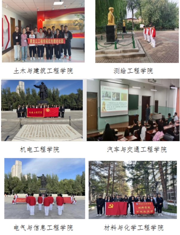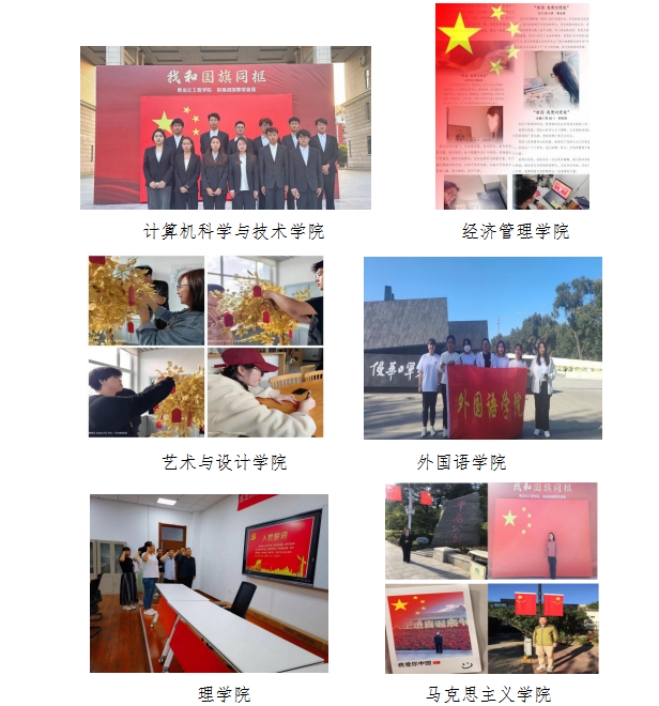 为营造热烈喜庆、安定祥和的节日氛围,各二级党组织也开展了主题鲜明、内容丰富的庆祝活动,吸引了师生的广泛参与,让大家度过一个平安、快乐、祥和的节日。土木与建筑工程学院党委开展了“花好月圆”庆中秋、“忆国庆往事 望百年征程”朗诵、“缅怀先烈迎国庆 坚定初心跟党走”参观东北烈士纪念馆、“我与国旗合影”、参观中国共产党人精神谱系主题教室等活动,引导学生沉浸式体验中华优秀传统文化,进一步厚植爱国情怀、传承红色基因,增强了学生的民族自信心与自豪感;测绘工程学院党委开展了“迎祖国74华诞 测绘学子献礼”我与国旗合影活动、“致敬革命英烈 庆祝祖国华诞”志愿实践服务活动、师生集体观影活动等,进一步加强学生爱国主义、集体主义、社会主义思想教育,引导青年学生听党话、跟党走;机电工程学院党委举行了“铭记历史 勿忘血泪”爱国主义教育主题团日活动、“强国有我——我与国旗合个影”爱国主义教育活动,通过一系列活动不断深化爱国主义教育,进一步坚定了青年学生永远跟党走的决心;汽车与交通工程学院党委策划了主题鲜明、形式新颖的快闪活动,开展了“我和国旗合张影”、秋季学期国防教育主题班会、“以史为鉴 振兴中华 ”参观东北烈士纪念馆和东北抗联博物馆等宣传教育主题活动,缅怀革命先烈的英勇事迹和崇高精神,体会今日幸福生活的来之不易;电气与信息工程学院党委举行了“烈士纪念日”致敬英烈活动,组织学生党员、学生团员代表来到杨靖宇烈士纪念碑前,重温入党入团誓词、缅怀革命先烈英勇事迹,铭记烈士功绩,弘扬革命精神,传承红色基因,赓续红色血脉;材料与化学工程学院党总支组织开展“我的中国”诗词诵读、组织师生收看烈士纪念日向人民英雄敬献花篮仪式、“我和国旗合个影”、传承红色基因主题纪念日等丰富多彩的主题教育活动,引导广大师生抒发爱国情怀,凝聚奋进力量;计算机科学与技术学院党总支组织召开“从我做起 振兴中华”主题班会、参观红色展馆、“我与国旗合影”等活动。在活动过程中,同学们齐唱国歌,将爱国热情融入到歌声中,以自己的方式向祖国告白,为国庆献礼;经济管理学院党委以支部为单位开展了“我和我的祖国”主题党日、“我与国旗同框 与祖国同心”、线上观看升旗仪式、学习习近平总书记在庆祝中华人民共和国成立74周年招待会上的重要讲话精神、“祖国,我想对你说”主题党日、“情暖中秋节,共祝祖国好”等活动,对师生进行了一次良好的爱国主义教育,激发了师生党员的爱国热情,凝聚起奋进新征程的合力;艺术与设计学院党总支举办了“喜迎中秋欢度国庆 祈愿家国平安”活动、“踔厉奋发强国防 勇毅前行向复兴”爱国主义国防教育主题党日活动、“我和我的祖国”随手拍活动。引导学生强化国防观念和忧患意识,为全面建设社会主义现代化国家、全面推进中华民族伟大复兴而奋斗;外国语学院党总支开展了“知史爱党、知史爱国、自信自强——参观侵华日军第七三一部队罪证遗址”主题实践活动“与国旗同框”活动,组织学生代表集中观看亚运会赛事等,激励和动员广大师生为实现中华民族的伟大复兴而努力奋斗;理学院党总支组织党员开展了“缅怀革命先烈 重温入党誓词”主题党日活动。通过此次主题党日活动,教师党员们更加深刻地认识到自身的责任和使命,表示要以更加饱满的热情投入到工作中去,积极落实立德树人根本任务;人文与社会科学学院党总支组织学生观看爱国教育主题电影、召开爱国主义教育主题班会,通过观影和主题班会,引导青年学生树立远大理想、热爱伟大祖国、担当时代责任,增强了学生对国家的认同感和自豪感。马克思主义学院党总支组织教师开展了“我与国旗合个影”活动,全体教师纷纷用自己独特的方式与国旗同框留念,表达对祖国的美好祝福,抒发浓浓的爱国情怀和对祖国崇高敬意工程训练中心直属党支部“我和我的祖国”为主题,组织党员创作书法和绘画作品,开展国庆“随手拍”,表达对祖国生日的美好祝福。