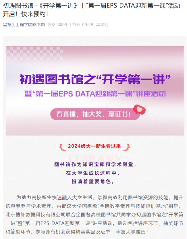 9月25日,图书馆联合EPS数据库开展新生信息素养线上培训。培训内容包括《图书馆与个人成长——图书馆如何助力大学生竞争力提升》《图书馆与大学生活——图书馆如何塑造我们的大学生活》《图书馆与学术之旅——学术探秘,解锁图书馆的无尽宝藏》。此次培训多角度解读了图书馆在大学生活中所扮演的重要角色,以全新视角传授多种探寻馆藏资源的方法,指导新生如何充实度过大学时光,助力学生自我提升和全面发展。线上讲座还安排了信息素养知识竞答和抽奖活动。