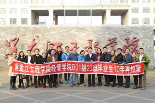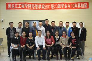 黑龙江工程学院管理系B01-23原班共有学生33人,此次10周年同学会共参加18人,同时邀请了原班主任孔超老师(现任思政部主任)、经济管理学院院长丁波、经济管理学院党委书记赖胜才和校友总会秘书长白国亮和校友工作办公室闫庚泽老师。