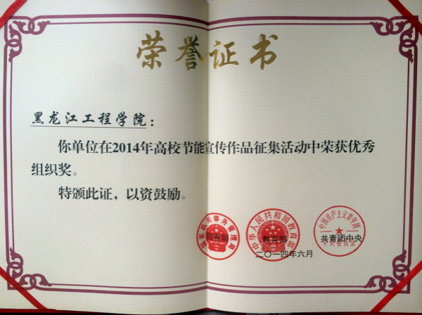 黑龙江工程学院在2014年高校节能宣传作品征集活动中荣获优秀组织奖;王兴彬老师创作的作品《我和年轮有个约定》,在标识标语类作品征集中荣获优秀奖;刘耀玉老师指导的学生马跃、廖光衡创作的作品《把黑夜照亮》,在视频类作品征集中荣获三等奖;刘耀玉老师指导的学生于美佳、潘恩泽创作的作品《不,差我一个》,在视频类作品征集中荣获优秀奖。