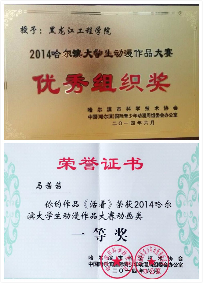 由中国(哈尔滨)国际青少年动漫周组委会办公室、哈尔滨市科学技术协会联合组织开展的2014哈尔滨大学生动漫作品大赛作品征集评奖活动己结束,经艺术学院组织申报,学校推荐,“大赛”专家评审,我校有9部动漫作品获奖;我校荣获大赛“优秀组织奖”。