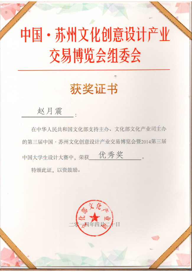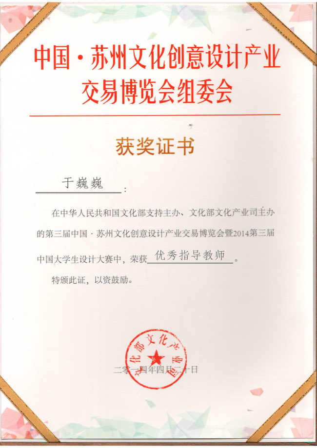 艺术学院教师在2014年1-3月期间,组织、指导学生参加由中华人民共和国文化部、文化产业司主办的第三届中国大学生设计大赛。赵月震同学的《69椅》、陈希彤同学的《水管公共座椅》在比赛中获得了优秀奖。于巍巍老师获得优秀指导教师奖。