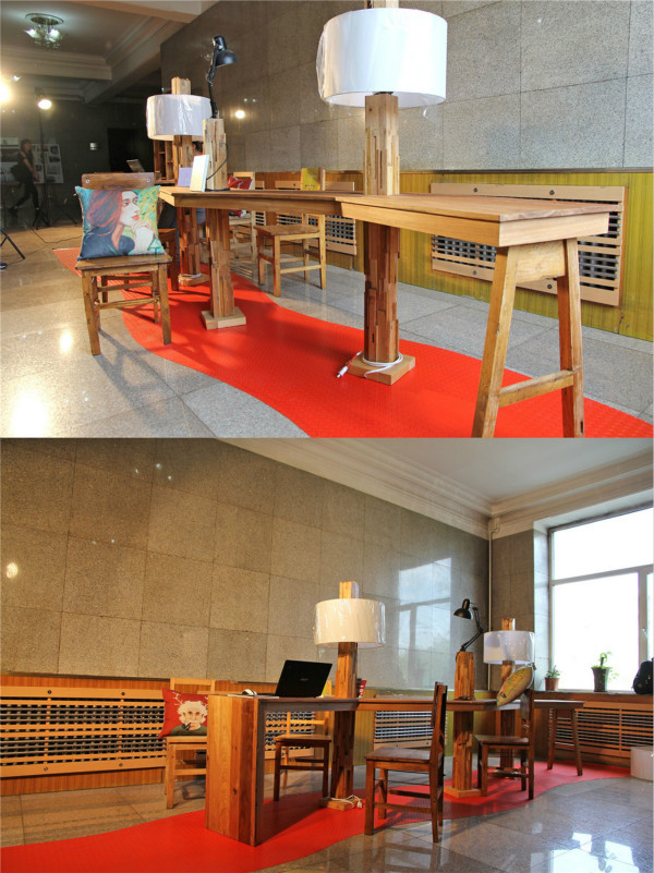 本次展览材料来自学校提供的废旧木质桌椅(另一部分为其他陈旧材料),通过家具设计工作室和环境艺术工作室师生两个月的设计与制作,最终展现出10个家具改造实物展区和1个设计作品展板展区。