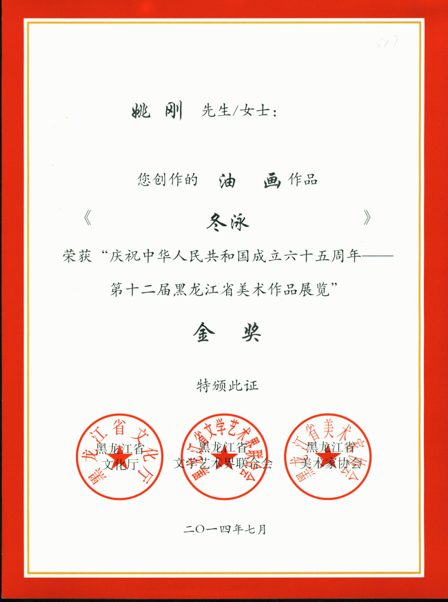 艺术学院油画工作室师生的参赛作品,获金奖1项、优秀奖2项及入选奖2项。姚刚老师的油画作品《冬泳》获金奖;宁静同学的油画作品《画室景物》和张勇同学的油画作品《冰雪——瓷》获优秀奖;霍玉杰同学的油画作品《冬日暖阳》和张经睿同学的油画作品《平静时光》获入选奖。我校油画中心主任姚刚代表本届油画获奖作者在开幕式上发言。