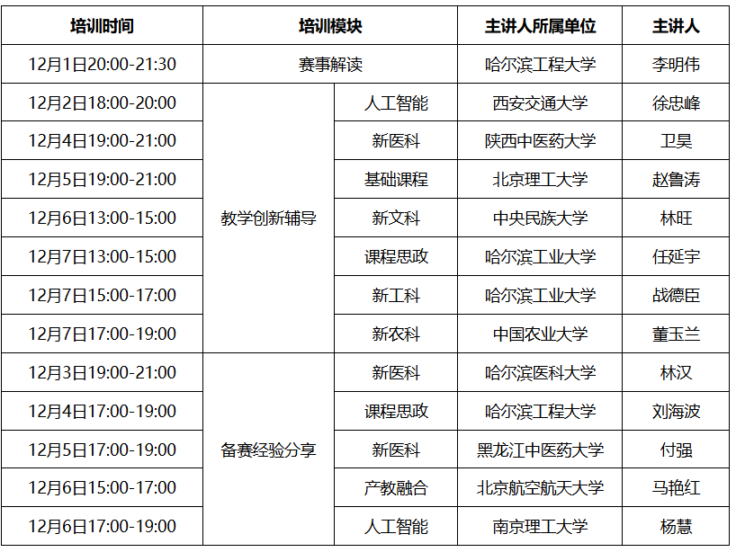 各学院(部): 为进一步推进教育教学改革,提高教师教学水平和育人能力,做好第六届全国高校教师教学创新大赛备赛,拟组织专家培训,具体事宜如下: 一、培训组织 主办单位:黑龙江省教育厅 承办单位:黑龙江中医药大学 二、培训时间及方式 (一)时间:2025年12月1日至12月7日 (二)方式:在线直播 三、培训内容及安排 邀请全国高校教师教学创新大赛主办校专家、国赛省赛评委、国赛一等奖获奖教师,分赛事解读、教学创新辅导、备赛经验分享等模块作专题辅导报告(培训安排详见附件,具体安排将通过平台进行公布:https://hljjf.mh.chaoxing.com)。 四、培训对象 拟参加教师教学创新大赛的本科高校教师;其他有意愿参加的专任教师。 请各学院(部)积极组织参赛教师和其他感兴趣的教师参加线上培训。