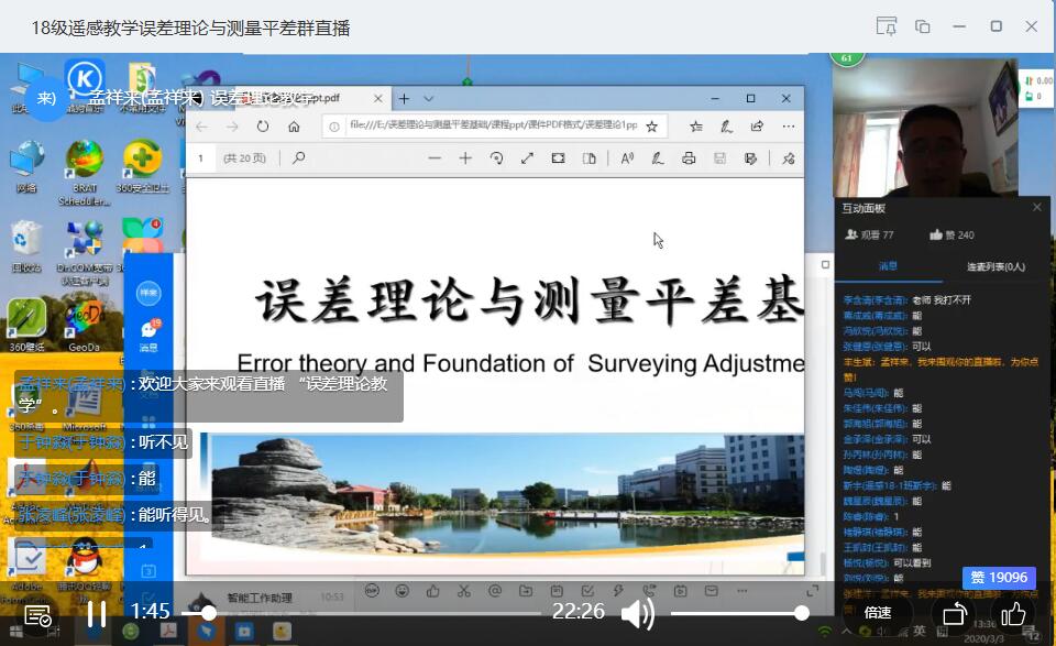 测绘工程系全体教师为了保障开学初的网络教学任务,充分利用假期时间,组织开展了应对新学期线上教学研讨会。通过钉钉群、微信群等进行了有效的线上交流和广泛的研讨,教师们积极发言,献计献策,充分做好了“延迟开学不停教,停课不停学,质量标准不降低”的准备。测绘工程系教师应用超星、腾讯会议、钉钉等线上平台进行一次全方位的教学方式方法的改革,确保线上教学的顺利优质开展。开学第一周,综合测绘工程系各门课程的特点和实际情况,采用多种线上平台教学授课,授课率100%!经过一周的线上教学,通过教师的交流和学生反馈,线上教学运行良好,达到了预期的教学目的。不仅打破了时空限制的教学模式,又辅以更多的教学资源,使学生们不仅提高了自学能力,还激发了学生的学习兴趣。上课出勤率高,线上连线发言踊跃,讨论问题激烈,更加锻炼了学生独立思考、独立完成作业的能力。
